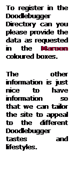 To register in the Doodlebugger Directory can you please provide the data as requested in the Maroon coloured boxes.